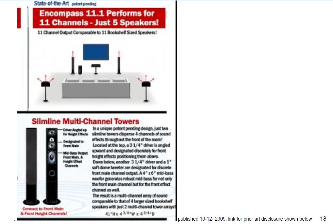 follows can be copied and pasted to access her public Album.https://www.facebook.com/media/set?set=a.102920596390827&type=3 Notably her Facebook page was also archived by Wayback Machine Dec. 7, 2014 further evidencing the content was public as the Wayback Machine does not archive pages that are not public. If necessary Heather will change her entire Fcaebook page back to public if it may help the link to her Fcaebook page archived as public on Wayback Machine be accessible again. Here is a link that can be copied and pasted evidencing her public personal Facebook was even archived by Wayback Machine December 7,2014 https://web.archive.org/web/20250000000000*/https://www.facebook.com/speaker.chic/ Referring to Heather’s prior art disclosure on page 18 (which is a close up section) and, page 19, the full publication reference, the same illustration with bullet points descriptions are disclosed relating to Heather’s prior art disclosure in this chart on page 15 also referenced on page 11-14 in this chart. What is further detailed in the prior art publication on page 18 and 19 in this chart is a detailed decsription for the prior art disclosure in this chart on page 15. Notably, it was published the same date as Heather’s prior art on page 15 because it is the back page of the publication. The additional details in the text description under the Slimline Multi-Channel Tower title further discloses that the smaller driver at the top which is angled upward for the height channel/signal (also illustrated and described on page 15 duplicated labeled at 1 in green) is a smaller 3 ¼” driver. Additionally further detailed, the direct-firing mid-bass woofer utilized for the mid-bass output of the height channel/signal (also illustrated and described on page 15 duplicated labeled at 2 in green) is a 4” x 6” woofer. Placed at the left and right of the television shown at the top right of the page on page 18 and 19 in this chart (at the locations specified for a left and right main speaker by conventional speaker formats selected from the group consisting of Dolby, THX and DTS) further disclosed and illustrated with arrows is the speaker system ”transmitings sound waves” Lastly, with further reference to opposing claim element ”an interface from a renderer to a speaker”, under the Slimline Multi-channel Towers illustration which is the same illustration with bullet points as on page 15 in this chart, beneath the illustration it says “Connect to Front Main and Height Channels”. The illustration of the speaker, combined with the textual description of "connect to height channels and main channels," inherently discloses the presence of an interface. A person of ordinary skill in the art would understand that this connection requires a terminal panel or similar interface on the speaker to receive audio signals from a renderer (receiver). The disclosure of connecting to "channels" further implies the receiving of audio signals ![]() can be copied and pasted https://www.facebook.com/photo/?fbid=102920693057484&set=a.102920596390827